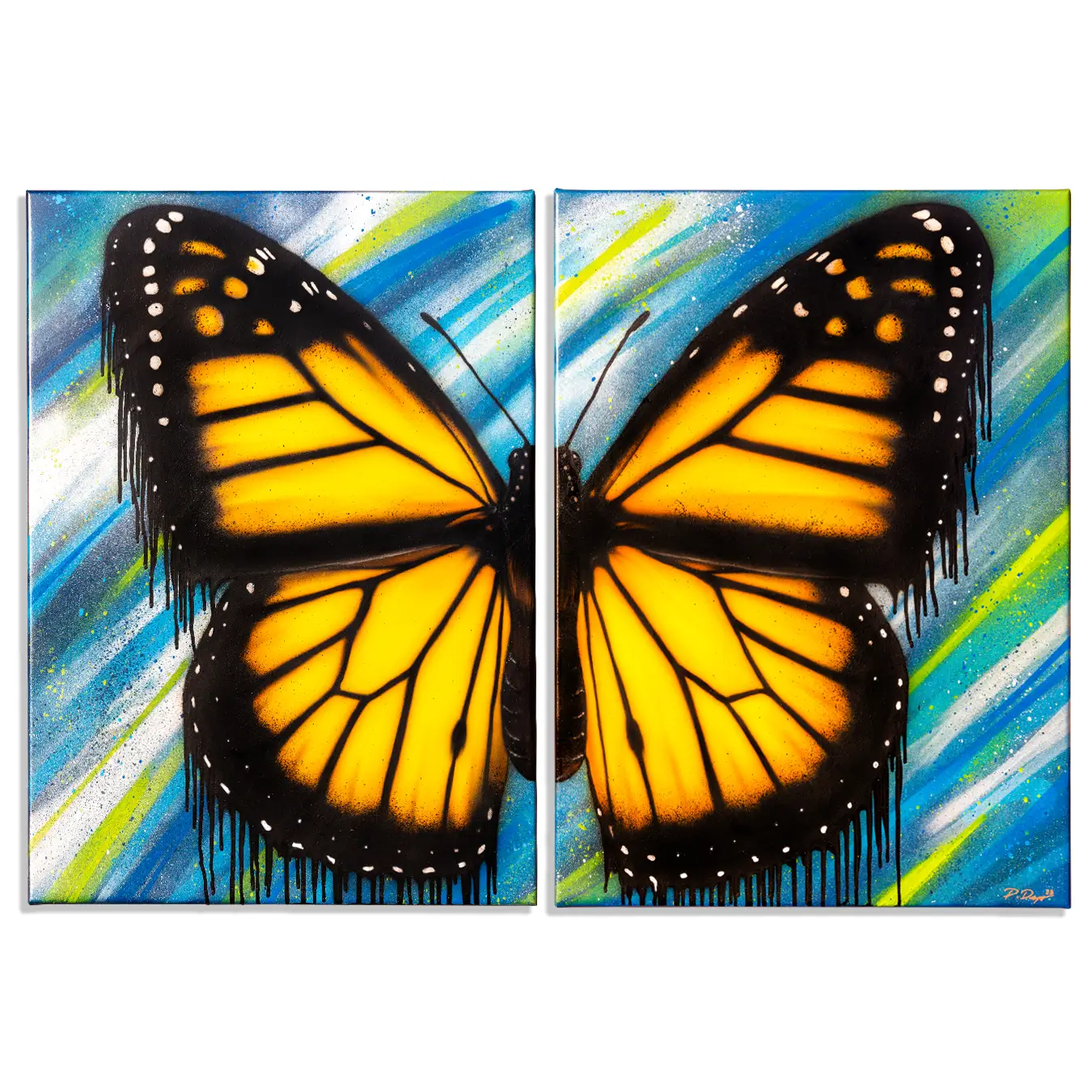 Erleben Sie mit „Split Monarch“ ein eindrucksvolles Diptychon, das Naturmotiv und urbane Street-Art verbindet. Der majestätische Monarchfalter entfaltet sich über zwei Leinwände und bildet erst im Zusammenspiel beider Teile das vollständige Motiv. Die leuchtenden Gelb- und Orangetöne der Flügel stehen im starken Kontrast zu den dunklen Konturen und den dynamischen Farbakzenten im Hintergrund. Dezente Farbdrips verleihen dem Werk eine moderne Graffiti-Ästhetik und unterstreichen die kraftvolle Wirkung des Schmetterlings.